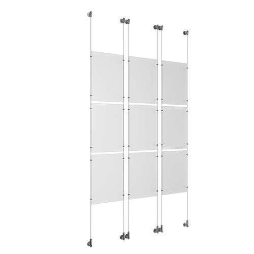 (9) 11'' Width x 17'' Height Clear Acrylic Frame & (6) Wall-to-Wall Aluminum Clear Anodized Cable Systems with (36) Single-Sided Panel Grippers