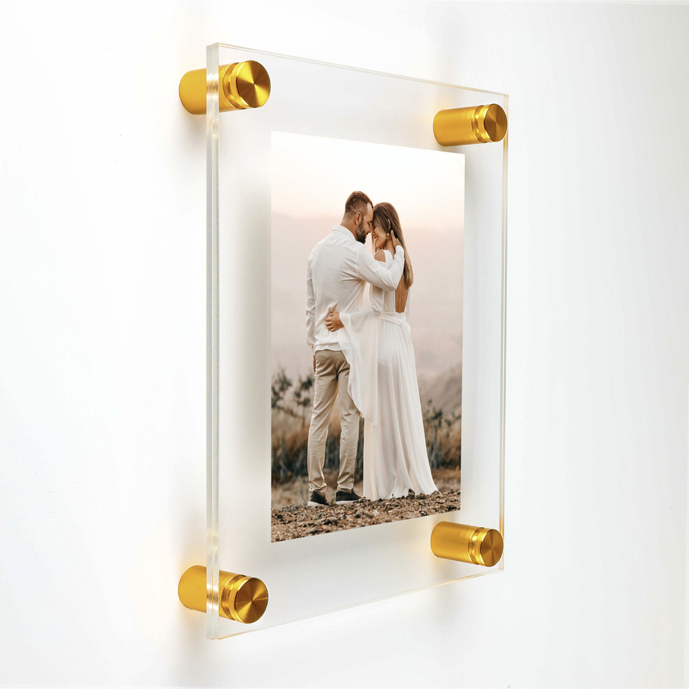 (2) 11'' x 13-1/2'' Clear Acrylics , Pre-Drilled With Polished Edges (Thick 1/8'' each), Wall Frame with (4) 3/4'' x 3/4'' Gold Anodized Aluminum Standoffs includes Screws and Anchors