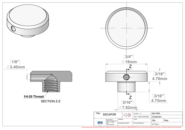1/4-20 Threaded Tamper Proof Caps Diameter: 3/4", Height: 3/16", Brushed Satin Stainless Steel 304, With Stem Diameter: 5/16", [Required Material Hole Size: 5/16'']