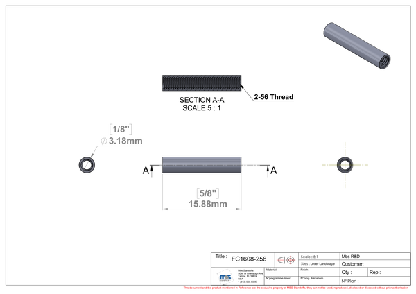The FC1607-256-SS-20 standoff is 9/16'' long with a 2-56 thread and is made of a Passivation Stainless Steel.